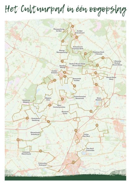 Het Cultuurpad ‘Van De Kiel tot Steenwijksmoer’ bestaat uit 23 verschillende wandelingen. De wandelingen laten zien hoe veelzijdig Drenthe is qua natuur, landschap en cultuur. Net als het Pieterpad kun je het cultuurpad van begin tot einde volgen, maar je kunt ook op iedere willekeurige route je wandeling beginnen.